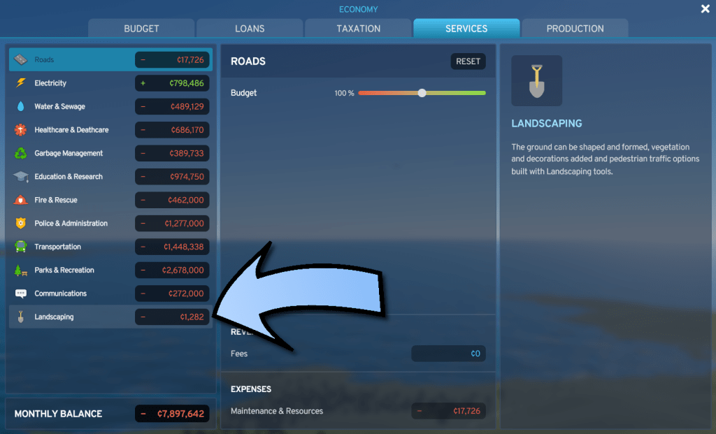 Don’t be mislead by this Landscaping section of the Services tab in the Economy menu – you can go wild with the landscaping tools and it won’t add to this expense; so far only pedestrian paths do.