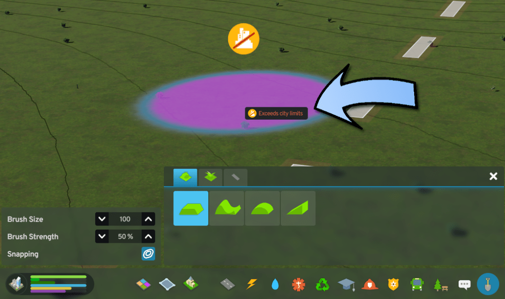 All four of the landscaping tools have the same options in this little box. Brush size ranges from 10 to 1000, 10 being the size of one zoning cell. Brush strength ranges from 1% to 100%. Above 10% it changes in increments of five and I can’t think of a time that I would use a strength less than 10%, though you can decrease it at single percentage steps after that.