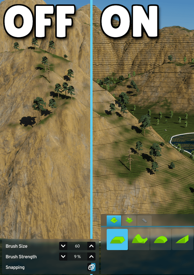 Using different strengths yields different results as you would expect them to. I tend to use higher strengths, often 100%, if I’m trying to soften a large area of land almost flat but not quite flat, making it more suitable for building and zoning easily. I then use lower strengths, often between 20 and 40%, if I’m trying to make terrain less sharp but still visually interesting after having shaped it with the level or shift terrain tools.